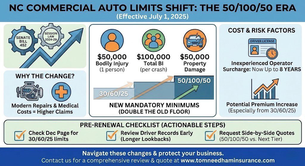 The shift to North Carolina 50/100/50 insurance limits marks a significant change for commercial auto policies. The new limits have been valid since July 1, 2025. The update is tied to a wider set of reforms, including the Senate Bill 452 insurance changes, that also adjust parts of the rating system. If your business uses vehicles, even one, the new minimums can change your renewal and your risk profile.